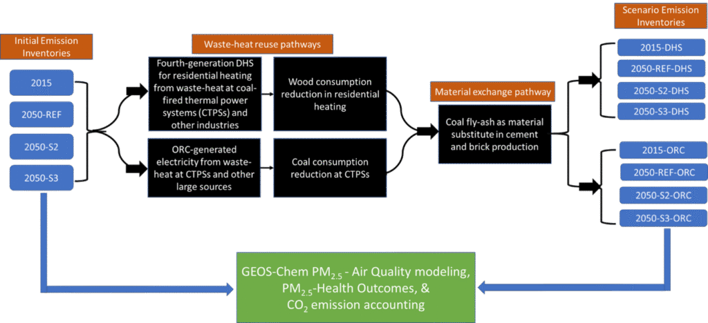 We evaluated circular transition strategies in India—district heating from industrial waste heat, organic Rankine cycles for waste-heat-to-power, and coal fly-ash material exchange—using scenario-based emissions, GEOS-Chem, and health impact assessment. Results show small nationwide PM₂.₅ improvements but larger benefits for CO₂ reductions and avoided premature mortality, especially under waste-heat-to-power pathways.